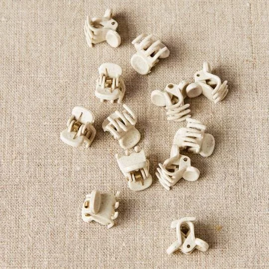 These little toothed-clips grip your knitting during or before seaming. They are also ideal for holding pieces to bag frames or sections for sewing.. They are a discreet clear-matte so the emphasis stays on your yarn or project, not on the clip.