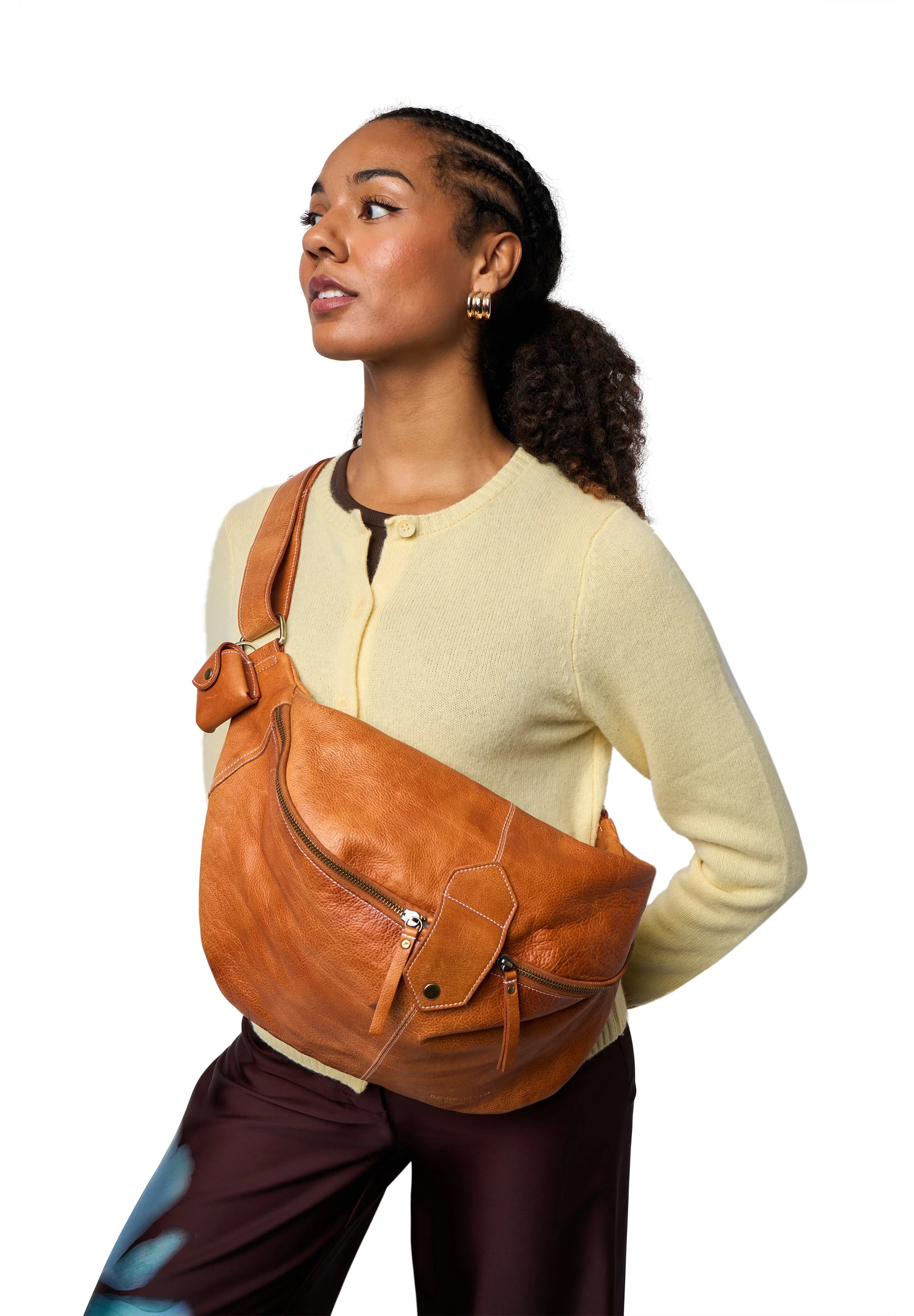 Elegant leather belt bag with two zippers and a snap closure. The adjustable strap ensures comfort, while the key ring keeps a measuring tape handy. Perfect for transporting your knitting stylishly and practically on the go. An indispensable companion for every knitting enthusiast.